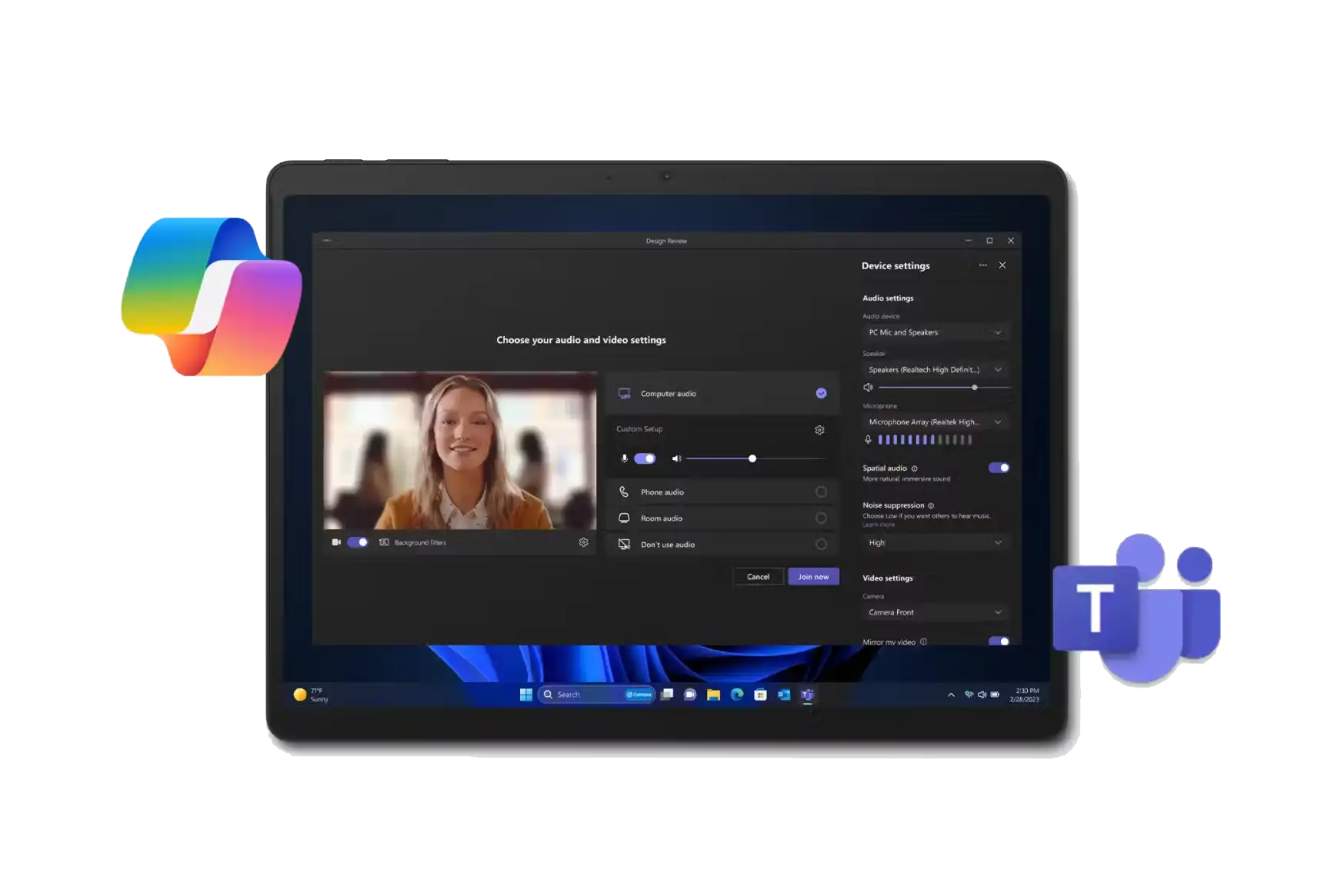 Una persona ajusta la configuración de su cámara y micrófono antes de unirse a una llamada de Teams, rodeada por el logotipo de Copilot y Teams, lo que sugiere cómo se puede utilizar la potencia de la IA en Teams.